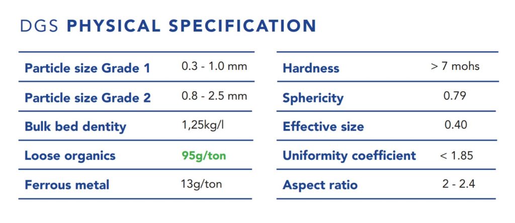 DGS is a filtration media made from 100% recycled glass in Dryden Aqua’s ultra-sophisticated glass factories. In contrast to AFM®, DGS is made from mixed glass and it is not subjected to any activation process. Nevertheless, DGS allows ultra-fine purely mechanical filtration while suffering a lot less from bacterial clogging than sand. Like AFM®, DGS is produced in strict compliance to ISO specifications and undergoes a unique washing process using 100% rainwater to become the best, safest and purest non-activated glass media on the market.