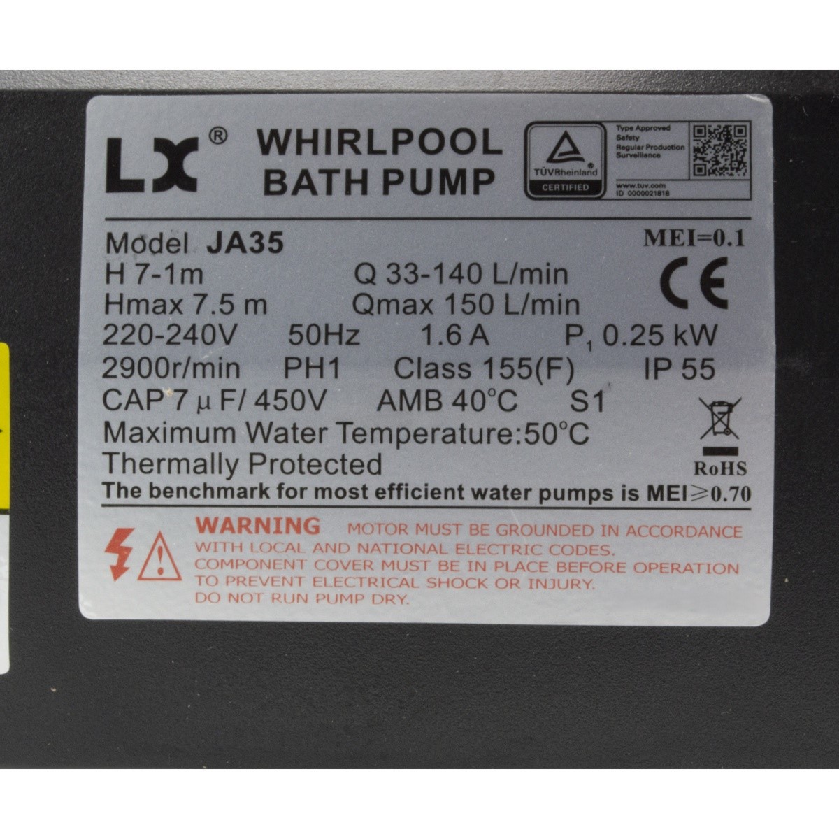 The LX JA35 is a high-quality and very popular circulation pump that can be used in almost all types of spas. Pumps from the LX brand are widely used in spa systems.